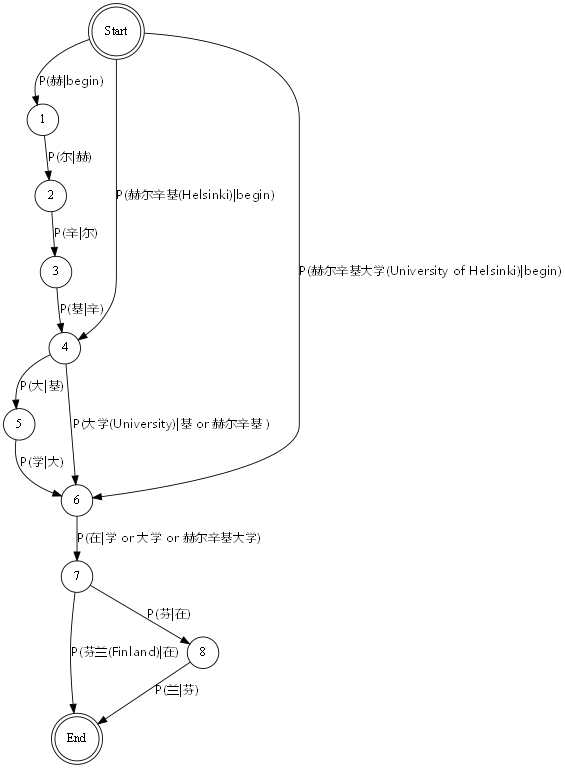 So far the probabilities are calculable. The workflow would be like (赫尔辛基大学在芬兰[The university of Helsinki is in finland/Helsingin yliopisto on suomessa]):